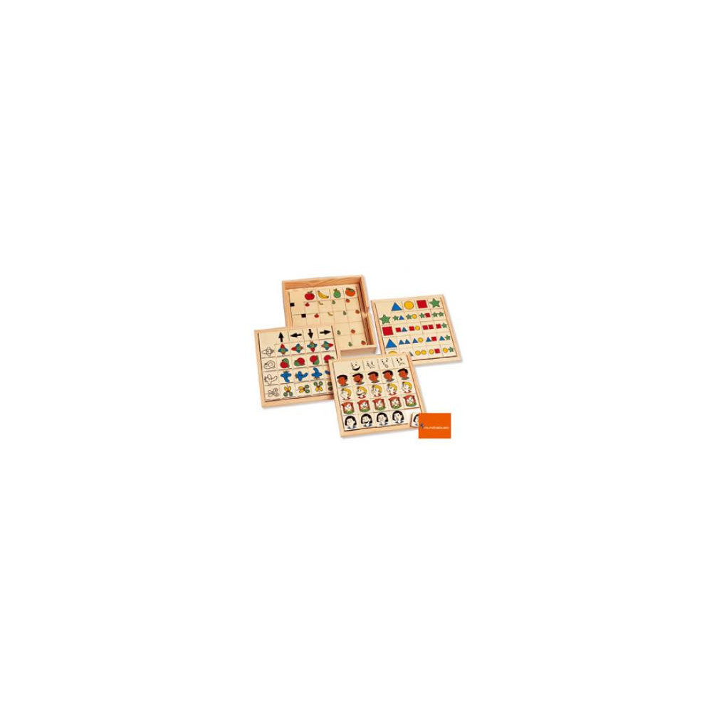 Juego de asociación lógica de distintos atributos, situación espacial, direccionalidad, etc. Fabricado en madera. 64 piezas.