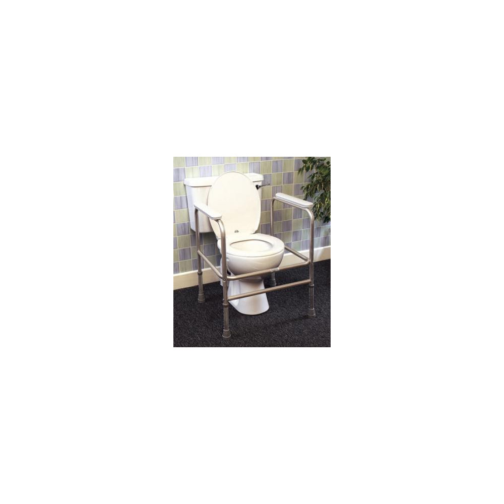 Cuadro de inodoro en aluminio anodinado no corrosivo. Regulable en altura de 64 a 74cm. Puede utilizarse con elevadores de inodoro. Ancho 59cm. Peso 2kg. Peso máximo del usuario 100kg.