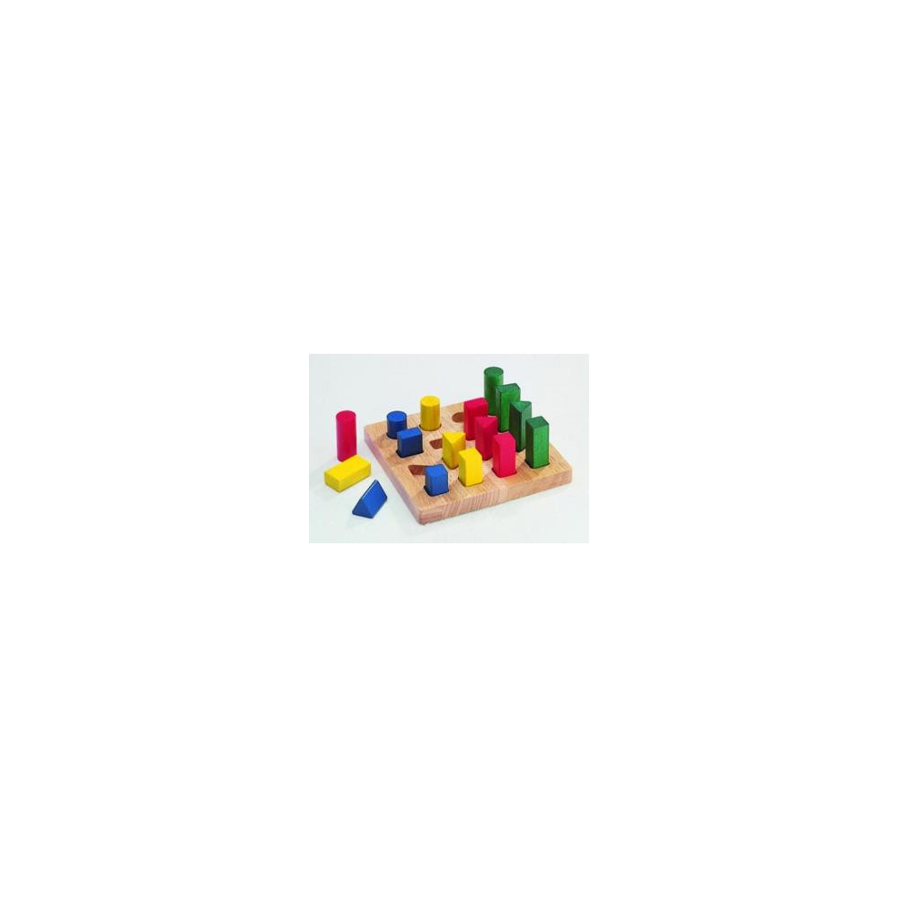 Juego de lógica y coordinació motriz. Compuesto por 16 piezas y un tablero de 20x20x2cm. Fabricado en madera.