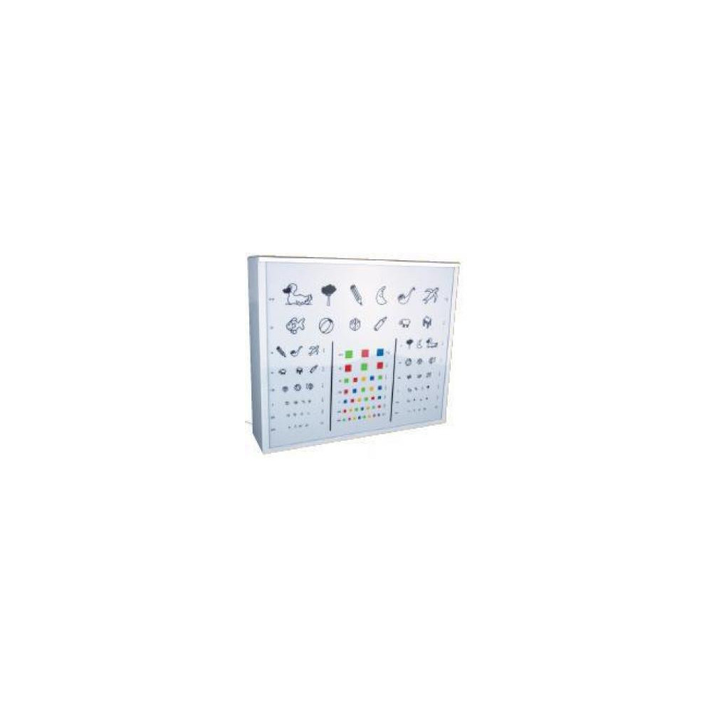 Escala optotipos infantil en acero inoxidable. Iluminación Por fluorescencia circular de 32 W .220 V. Peso: 5 Kg. Medidas: 450 x 105 x375 cm.