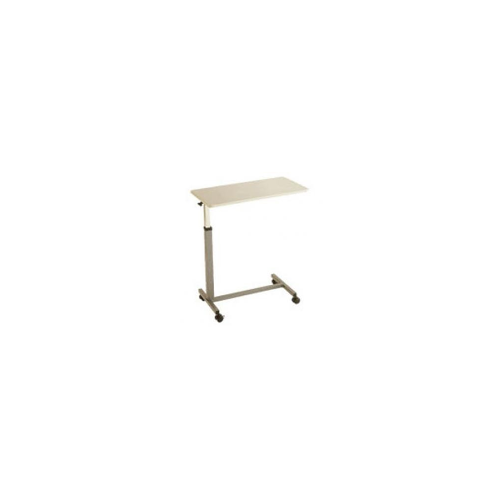 Mesa de cama dotada de un sistema de contrapeso instalado en la columna que permite variar la altura de esta mesa con un mínimo esfuerzo y sin riesgo de derramar la comida. Equipada con cuatro ruedas, dos de ellas con freno. Altura regulable de 71 a 113,5