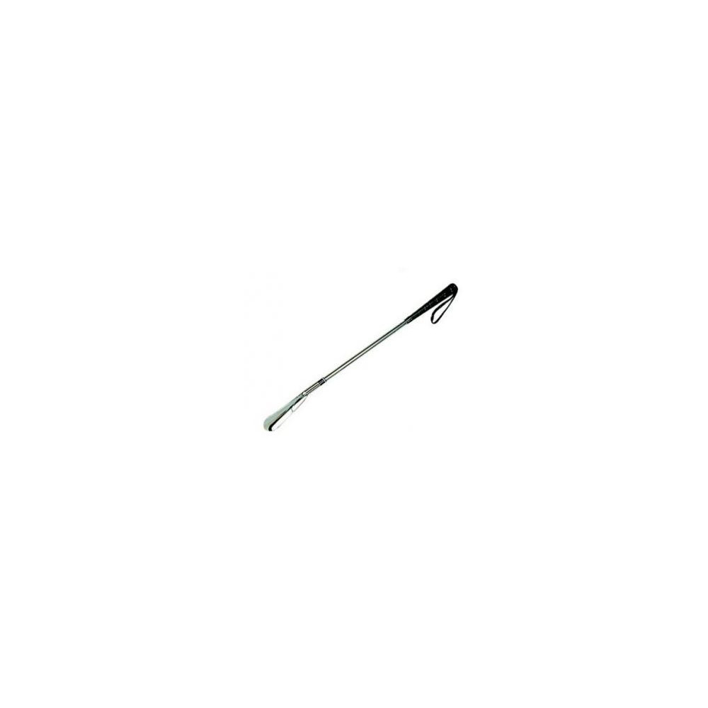 Calzador de metal cromado con mango recubierto de cuero para facilitar el agarre y muelle en la base que permite bascular el calzador a la posición adecuada. Longitud: 60 cm. Peso: 115 g.