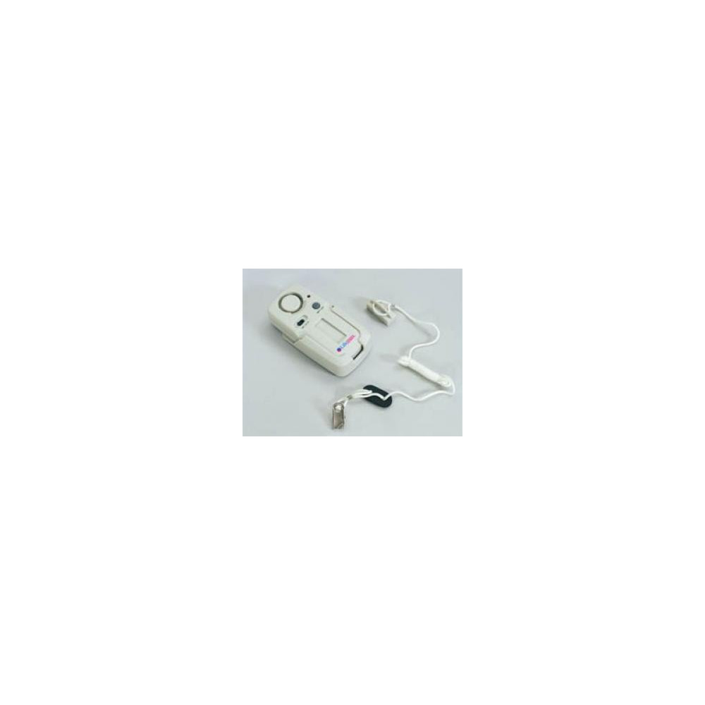 Alarma de aviso para personas mayores o discapacitados. Puede engancharse mediante velcro a sillas o camas o atornillarlo a la pared. El aparato consta de un imán unido a un cordón con una pinza que se sujeta a la ropa. Cuando el paciente se levanta o hace un movimiento brusco, el imán se separa y dispara la alarma. El volumen puede ajustarse. Funciona con dos pilas AAA (no incluidas). Posee un botón para comprobar el estado de las baterías. Medidas: 10,8 x 5,1 x 2,5 cm. Peso: 130 g.
