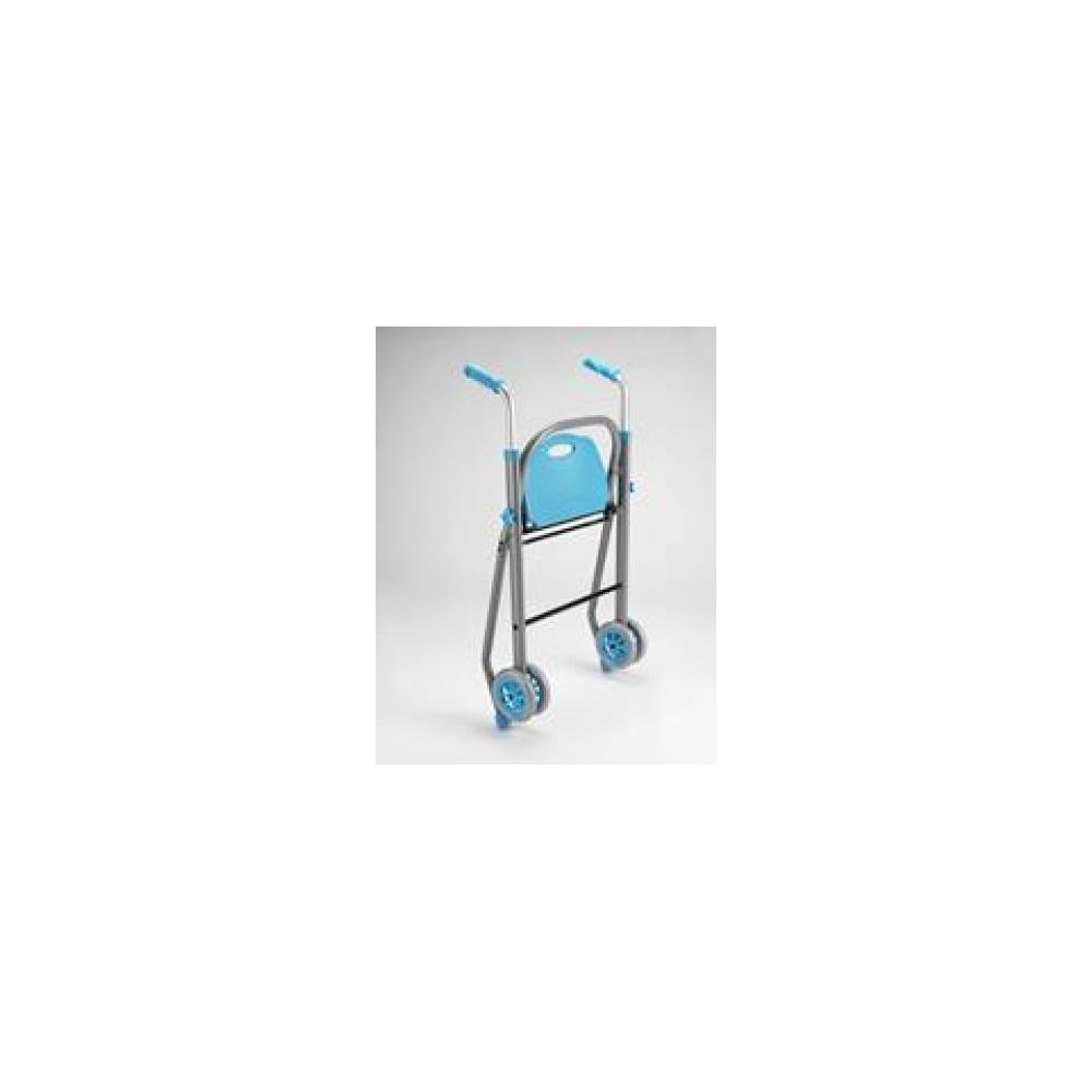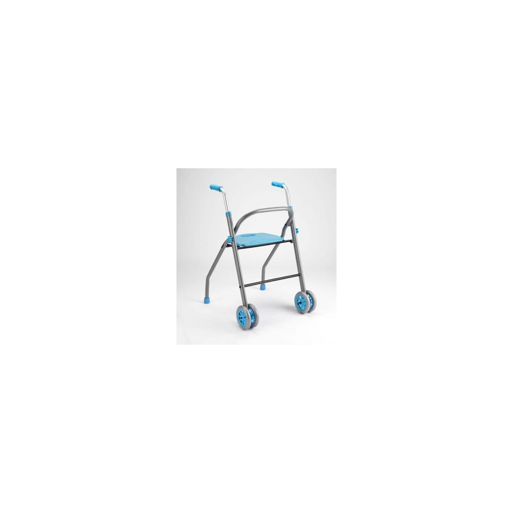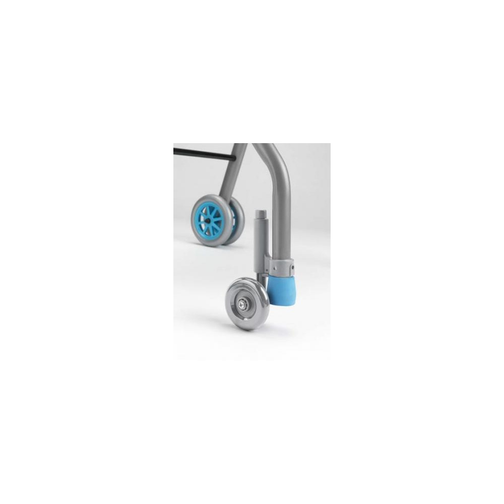 Andador de aluminio con asiento. Plegable manualmente. Empuñaduras ergonómicas y regulables en altura mediante ajuste en 5 posiciones (79.5-82-84.5-87-89.5-92 cm). Distancia entre puños: 50 cm. Distancia entre la parte interna de las patas traseras: 46.5 cm. Profundidad total: 69 cm. Ancho total: 67 cm. Diámetro ruedas traseras: 17 cm. Diámetros de las ruedas delanteras: 19 cm. Altura asiento: 55 cm. Dimensiones de la bolsa: 39 x 38 x 10 cm. Peso máximo: 136 Kg. Peso: 3.3Kg. Dispone de un kit de ruedas traseras basculantes (opcional).