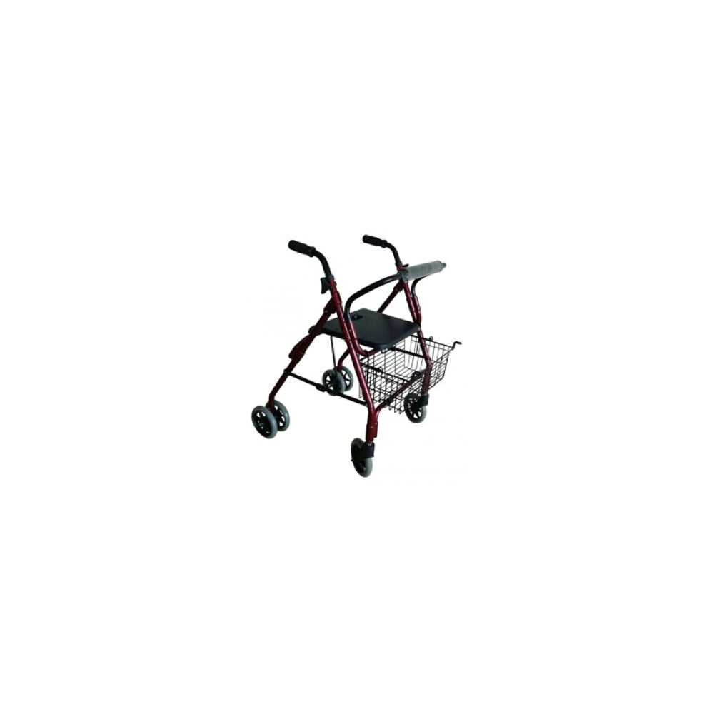Andador de aluminio plegable, consta de 4 ruedas traseras y dos delanteras, asiento y cesta de la compra. Regulable en altura. Dispone de frenos que se accionan presionando las empuñaduras. Altura total 85-96cm. Altura del suelo al asiento 50 cm.