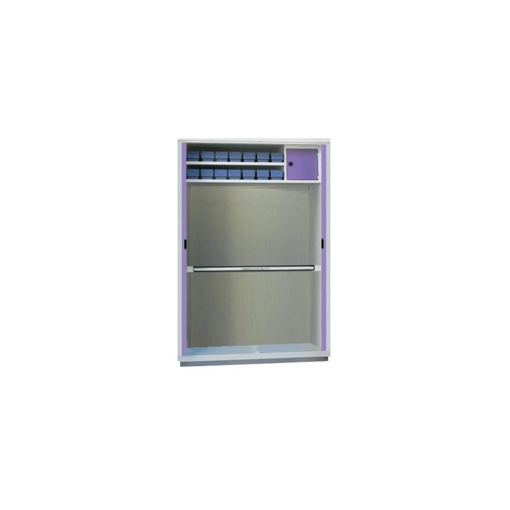 Armario de acero inoxidable con 2 puertas de persiana metálico. Fabricado en acero de 1mm de espesor, lacado en epoxi de 80-90micras y secado a 180º 20'. Compuesto de 1 caja fuerte para estupefacientes más estante, mesa de trabajo escamoteable, equipamiento según el gusto del cliente, posibilidad de integrar frigorifico (consultar .Medidas 1515 x 505 x 2000. Equipamiento no incluido.