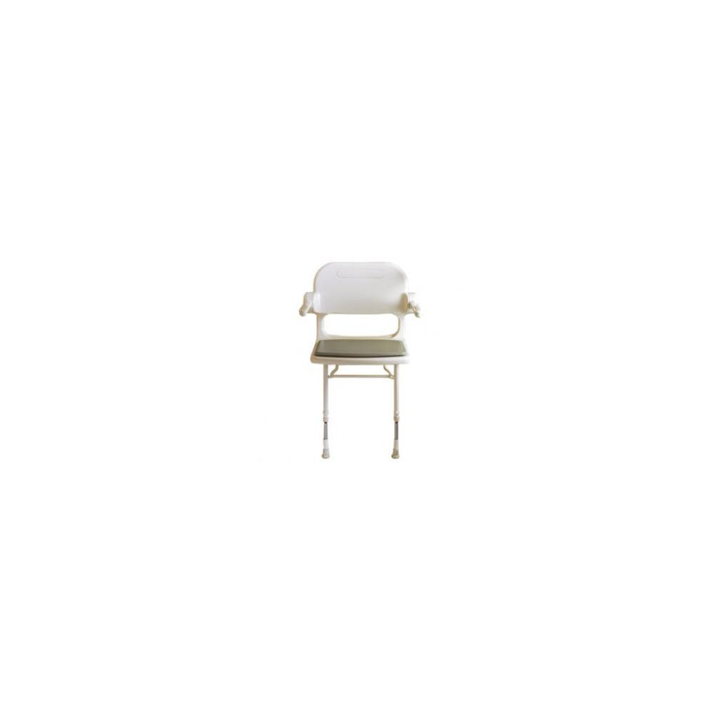 Asiento acolchado estandar con respaldo y apoyabrazos Marco con recubrimiento de aluminio pulverizado. Asiento extraible, moldeado con agujeros de drenaje para reducir la retencíon de agua y facilitar la limpieza. Altura ajustable. Patas acabadas en tapones de goma para evitar resbalones y no dañar la superficie de la ducha. Ajuste de precisión de una pata para adaptarse a las irregularidades de la superficie. Color del cojín: Gris Alturas máxima y mínima del asiento: 607-482mm Ancho total: 424mm Ancho mínimo del plato: 700mm Capacidad de peso 159Kg