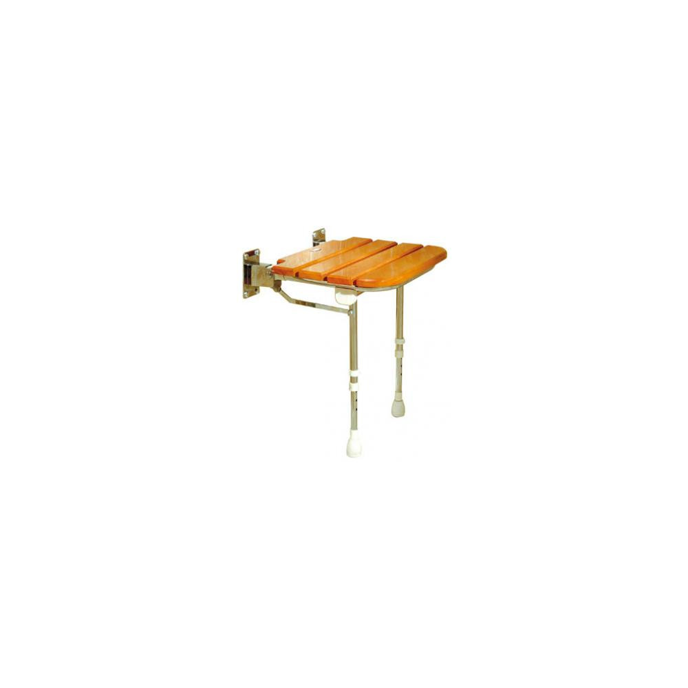 Asiento de ducha plegable de madera. Las tablas son de caucho ecológico protegido por barniz. Marco y patas fabricados en acero inoxidable pulido. Altura regulable de 39 a 64cm. Incluye dos soportes de montaje de acero inoxidable. Color del cojín: Madera Alturas máxima y mínima del asiento: 640-390mm Ancho total: 460mm Ancho mínimo del plato: 700mm Capacidad de peso 253Kg