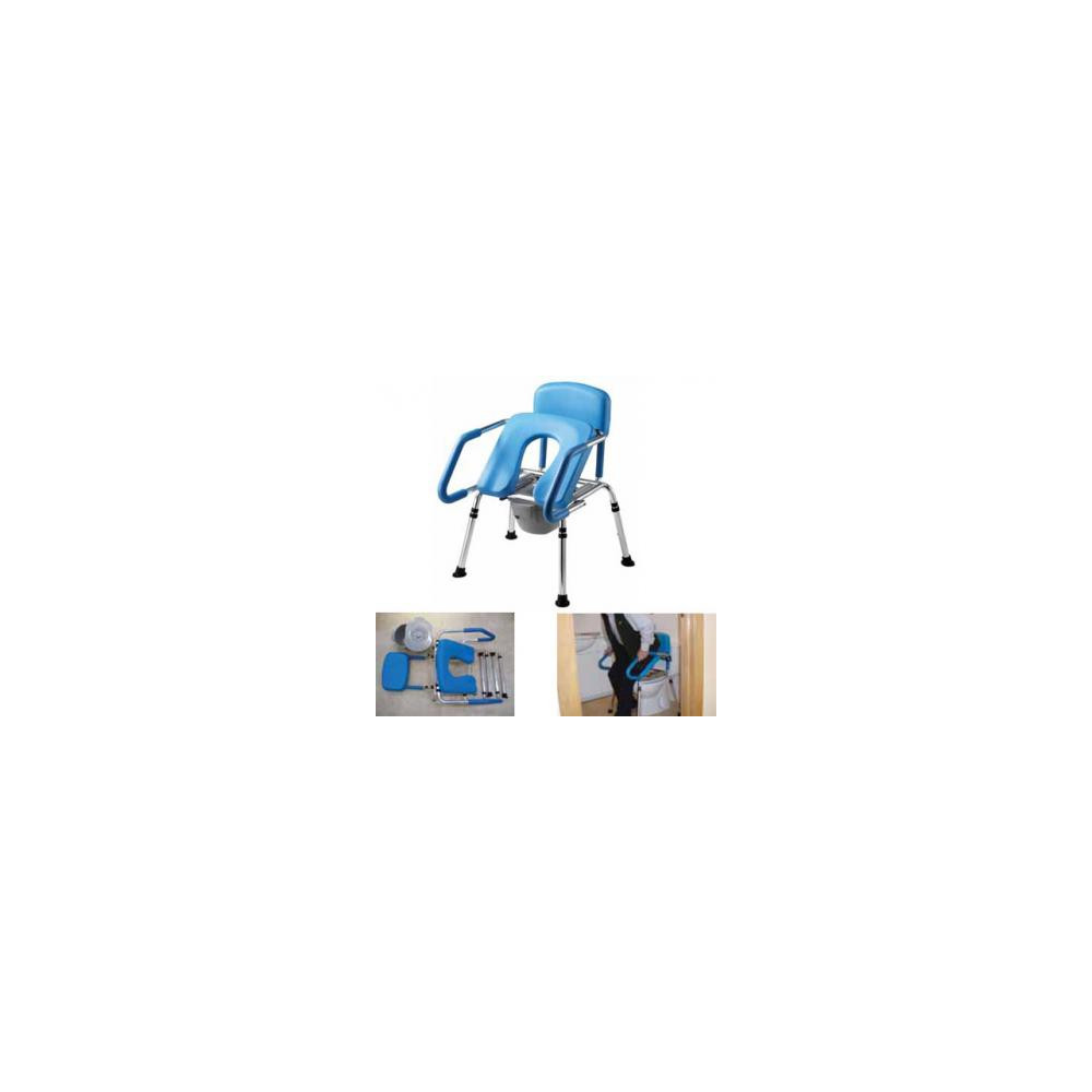 Silla de baño de aluminio. Su diseño aprovecha el peso y la fuerza que la persona ejerce para ayudar a incorporarse. Asiento ergonómico PU (poliuretano). Se puede usar encima del inodoro. Peso máximo:150Kgs. Ancho del asiento:41 cm, profundidad del asiento: 40 cm. Altura del suelo al asiento: 53 a 63 cm. Ancho entre patas 54 cm. Ancho entre patas delanteras y traseras:52 cm.