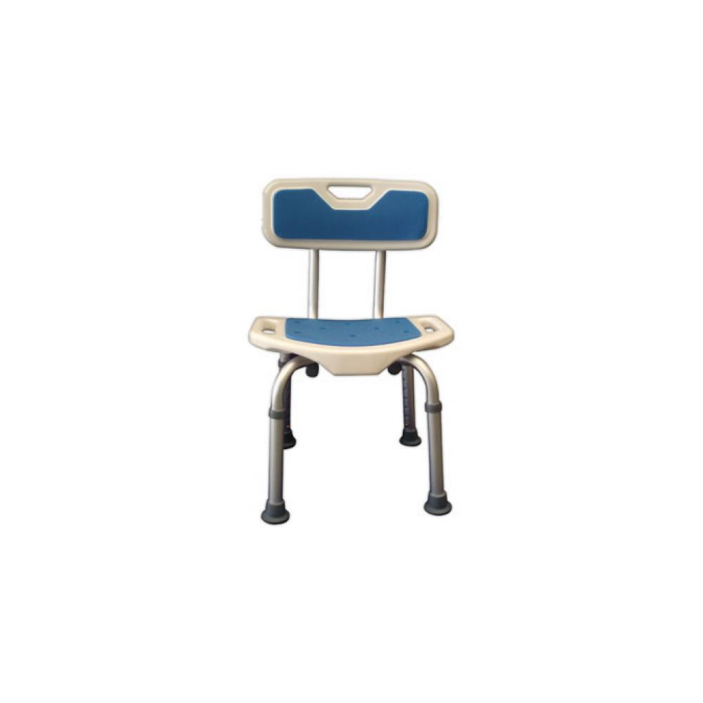 Banqueta de aluminio con respaldo y altura regulable por medio de patas extensibles provistas de conteras de caucho para mayor estabilidad. El asiento tiene desagües y asideras para mejor higiene y seguridad. Altura del asiento: 48-58 cm. Peso máximo del usuario: 100 Kg