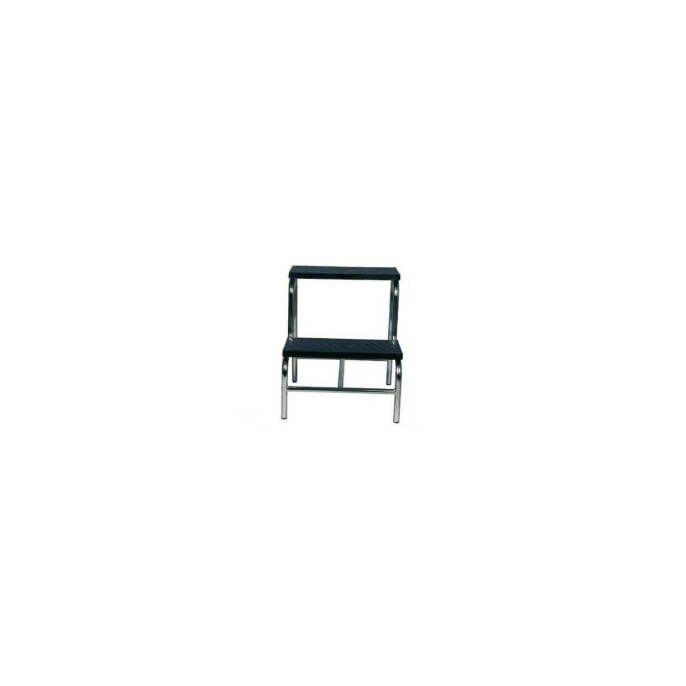 Banqueta de acero de 2 tramos. Con conteras. Goma antideslizante. Peso: 5 Kg. Medidas: 430 x 200 x 510 cm. Disponible en acero inoxidable (1MC416-AI) y en acero cromado (1MC0416-AC).