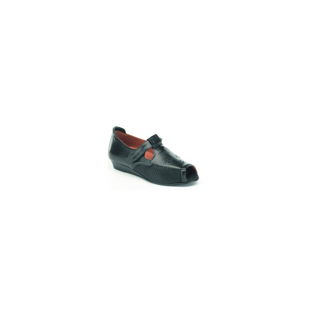 Calzado de color negro. Pala de fibra elástica, piso de micro-goma negra, cuña forrada en piel. Plantilla extraíble.Tacón 2 cm. Tabla 13. Disponible del 33/43.