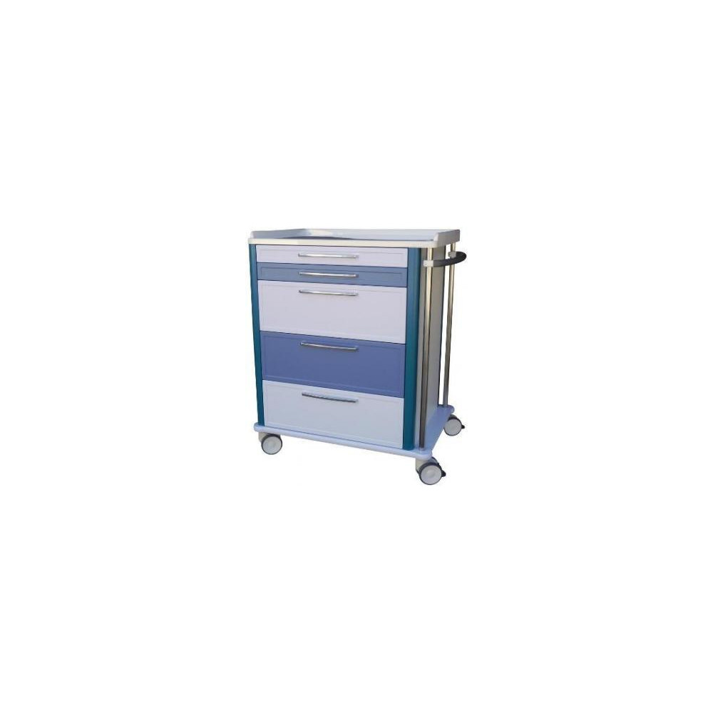 Carro multifunción, con encimera en ABS moldeada en 1 pieza con protección perimetral y fácil limpieza. Cuerpo termoconformado con perfiles de aluminio cromado y acero inoxidable (Sin látex).Tirador ergonómico de poliuretano inyectado color a elegir. Ruedas dobles de Ø125mm . 2 de ellas con freno total. Compuesto por guías telescópicas con sistema de retención, apertura del 110% . Colores de frente a elegir. Medidas de los cajones: 2 de 600 x 400 x 50, 3 de 600 x 400 x 200. Módulos ISO incluídos. Medidas: 900x600x1050 mm.