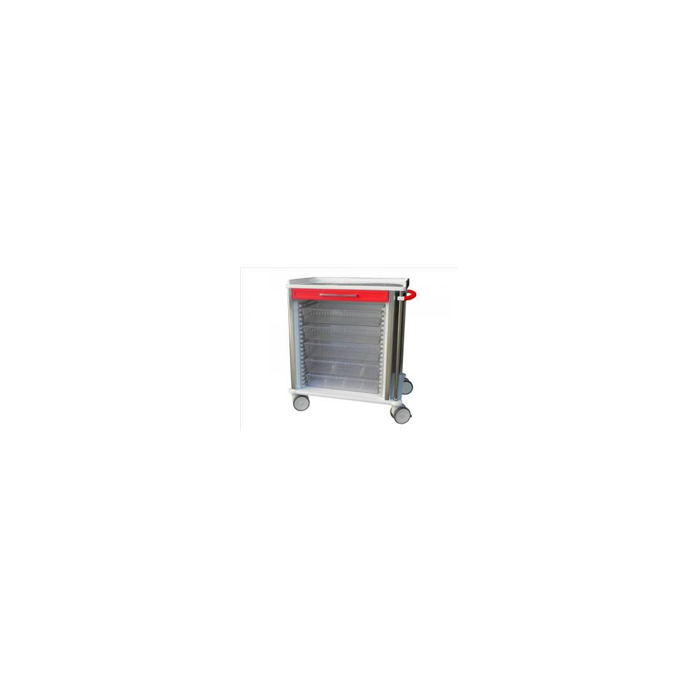 Carro multifunción, con encimera en ABS moldeada en 1 pieza con protección perimetral y fácil limpieza. Cuerpo termoconformado con perfiles de aluminio cromado y acero inoxidable (Sin látex).Tirador ergonómico de poliuretano inyectado color a elegir. Ruedas dobles de Ø125mm . 2 de ellas con freno total. Compuesto por guías telescópicas con sistema de retención, apertura del 110% . Colores de frente a elegir. Medidas de los cajones: 1 de 600 x 400 x 50 y 5 de 600 x 400 x 100. Módulos ISO incluídos. Medidas: 900x600x970 mm.