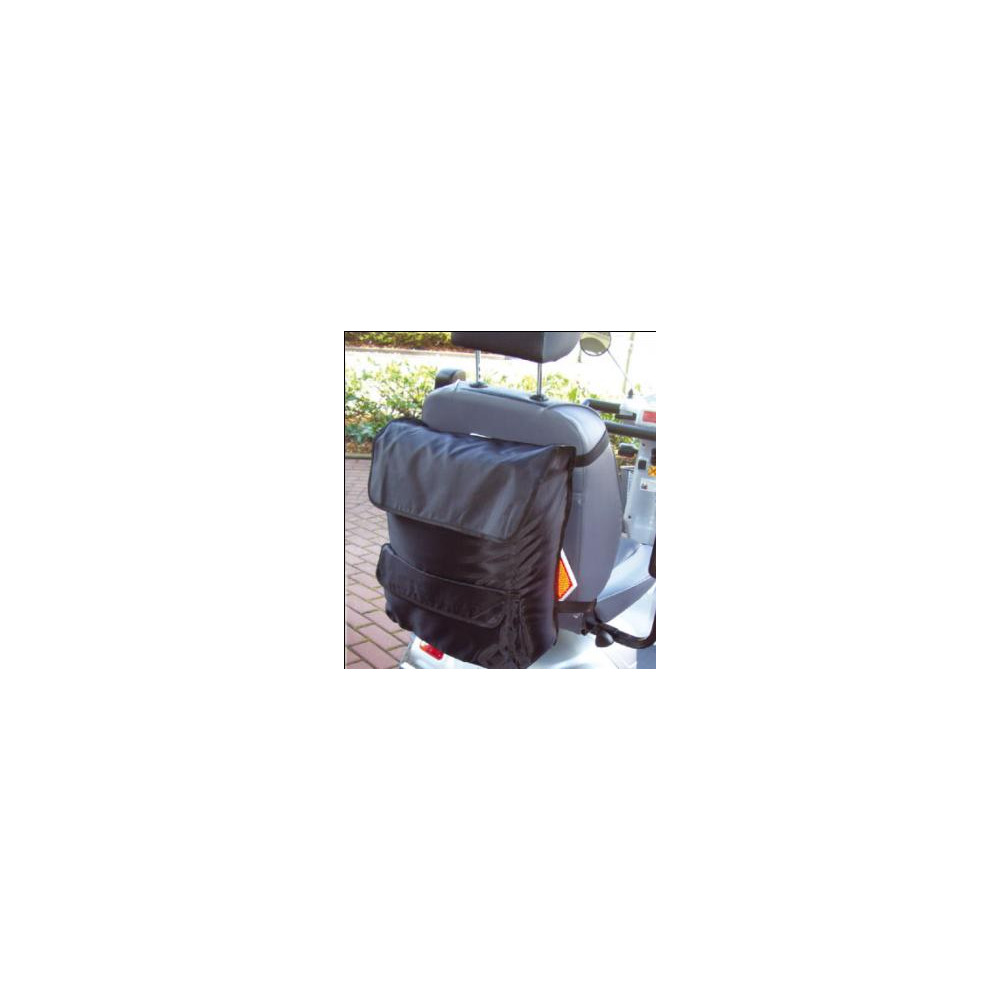 Práctica bolsa impermeable de nylon. Se puede colgar de los puños en la parte trasera de la silla de ruedas y también tiene unas asas largas para llevarla. Alto: 45 cm. Ancho: 38 cm. Fondo: 12 cm.