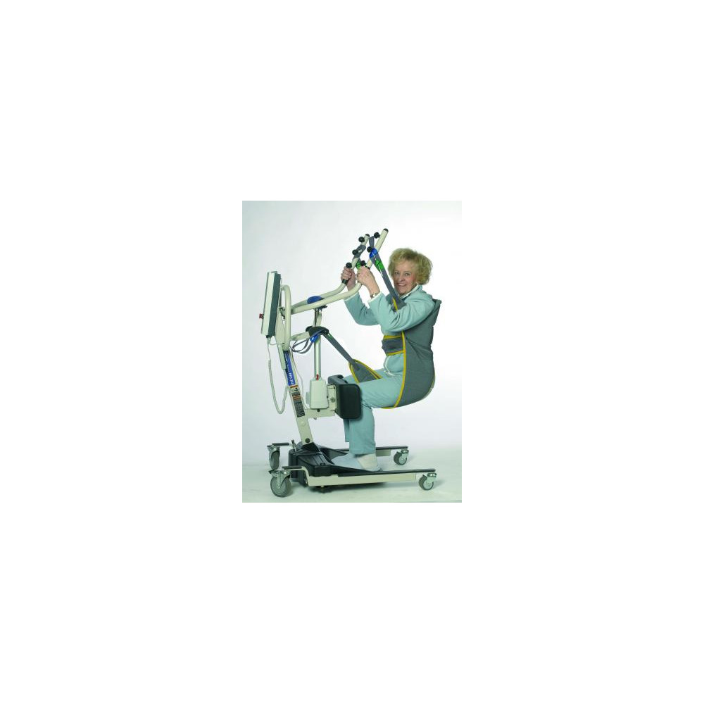 Grúa pequeña y maniobrable. Puede utilizarse para atender diferentes niveles de dependencia, desde aquellos usuarios que precisan una ayuda total hasta aquellos usuarios que precisan simplemente una ayuda en rehabilitación.Incorpora características de ajuste innovadoras adaptadas a distintos tamaños de usuarios y formas, proporcionan confort en todas sus alturas. Soportes de piernas giratorios y ajustables en altura con contornos laterales aseguran la posición de las piernas. Eslinga de transferencia: para transferencia de pie, acolchada para mayor confort y base antiderrape en la espalda. Eslinga de transferencia sentado: Para transferencia en posición semi-sentado, acolchada para mayor confort. Peso máximo del usuario: 158 Kgs. Altura total 172 cm. Largo total: 90 cm.