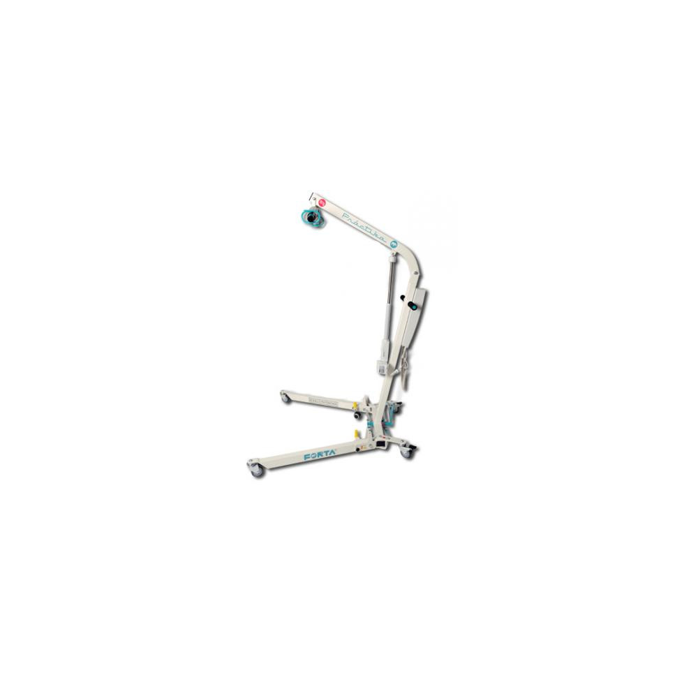 Sistema totalmente innovador de plegado. A diferencia de otras ya existentes, esta grúa se pliega en vertical, siendo más ergonómica ya que el cuidador la puede plegar fácilmente y requiriendo menor esfuerzo. Además este sistema de plegado consigue que la grúa sea más fácil de guardar. Gracias a su diseño exclusivo de "apertura de patas en compás", al abrir las patas delanteras se abren también las traseras aumentando así la base de la grúa y ofreciendo una mayor estabilidad que una grúa. Ancho total 56cm. Altura de percha: 165cm. Longitud de patas: 120cm. Motor 6000N. Peso Máximo Soportado: 150Kg.