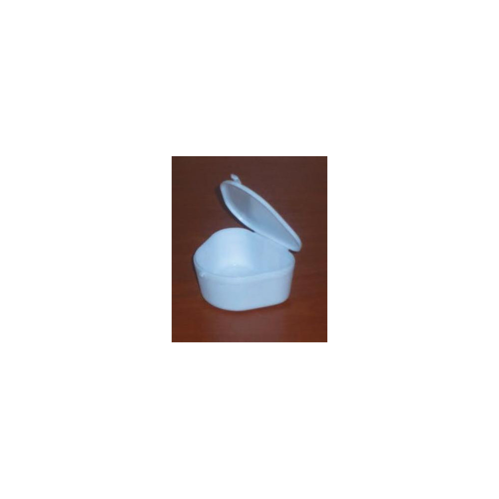 Contenedor con forma de media luna de paredes flexibles e impermeables, provisto de tapa a presión unida mediante charnela con cierre de fácil manejo. Contención y conservación de prótesis dentales, a cuya forma se adapta. Puede contener líquidos para desinfección de la prótesis pero no durante el transporte. Capacidad util: 180 cc. Altura (cerrado): 45 mm. Ancho máximo: 100 mm. Largo (radio media luna): 87 mm. Peso: 28 grs.
