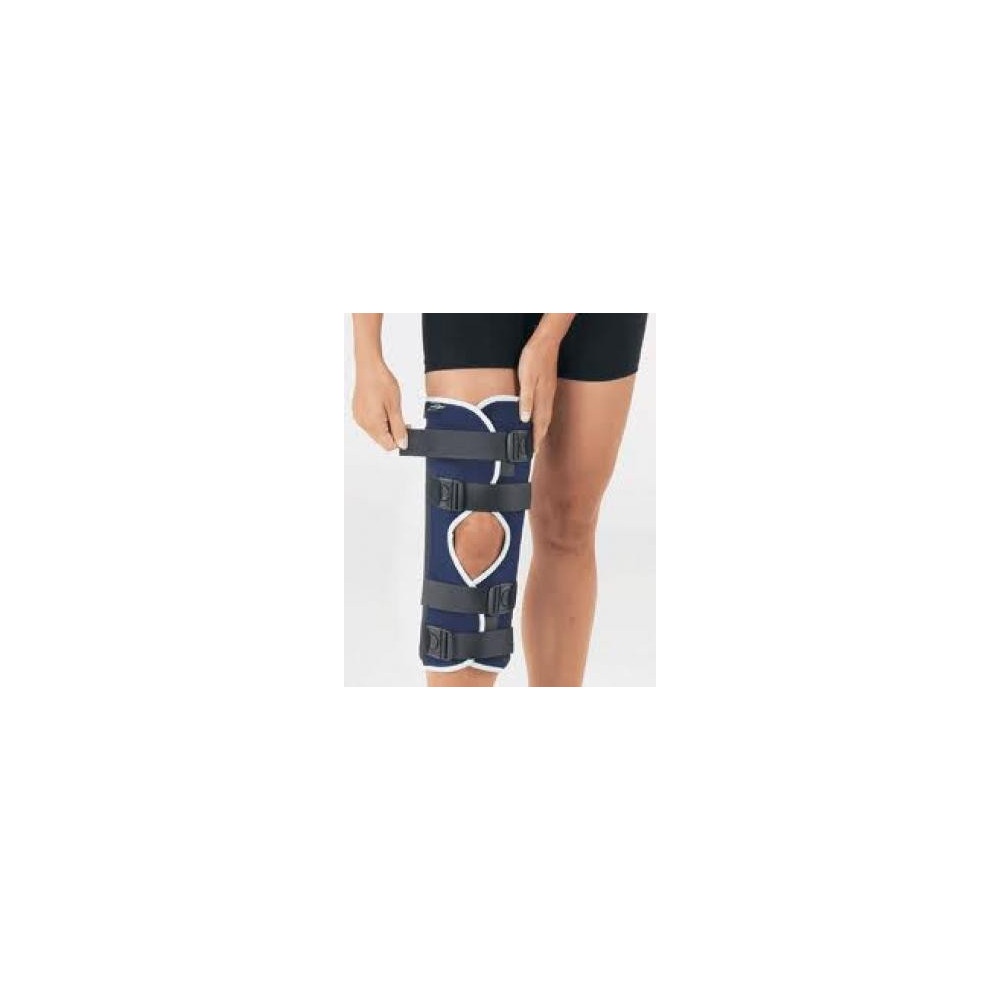 Férula de rodilla no articulada. Inmovilizazción de la rodilla en extensión. Compuesta por 3 volantes textiles que permiten adaptarse al máximo a la morfologia del paciente. Modelo bilateral.