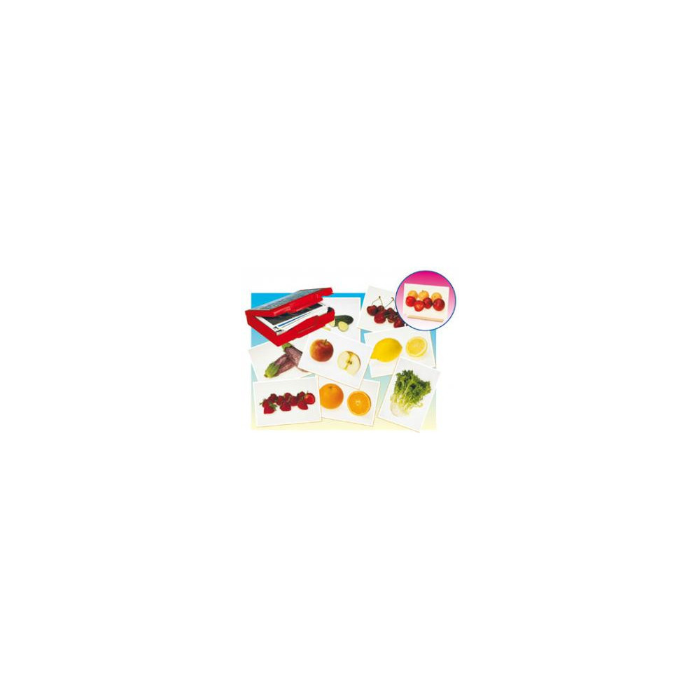 50 fotografías de alimentos cuyas imágenes presentan siempre dos estados diferentes. Incluye guía y peana para sujetar las fotografías.