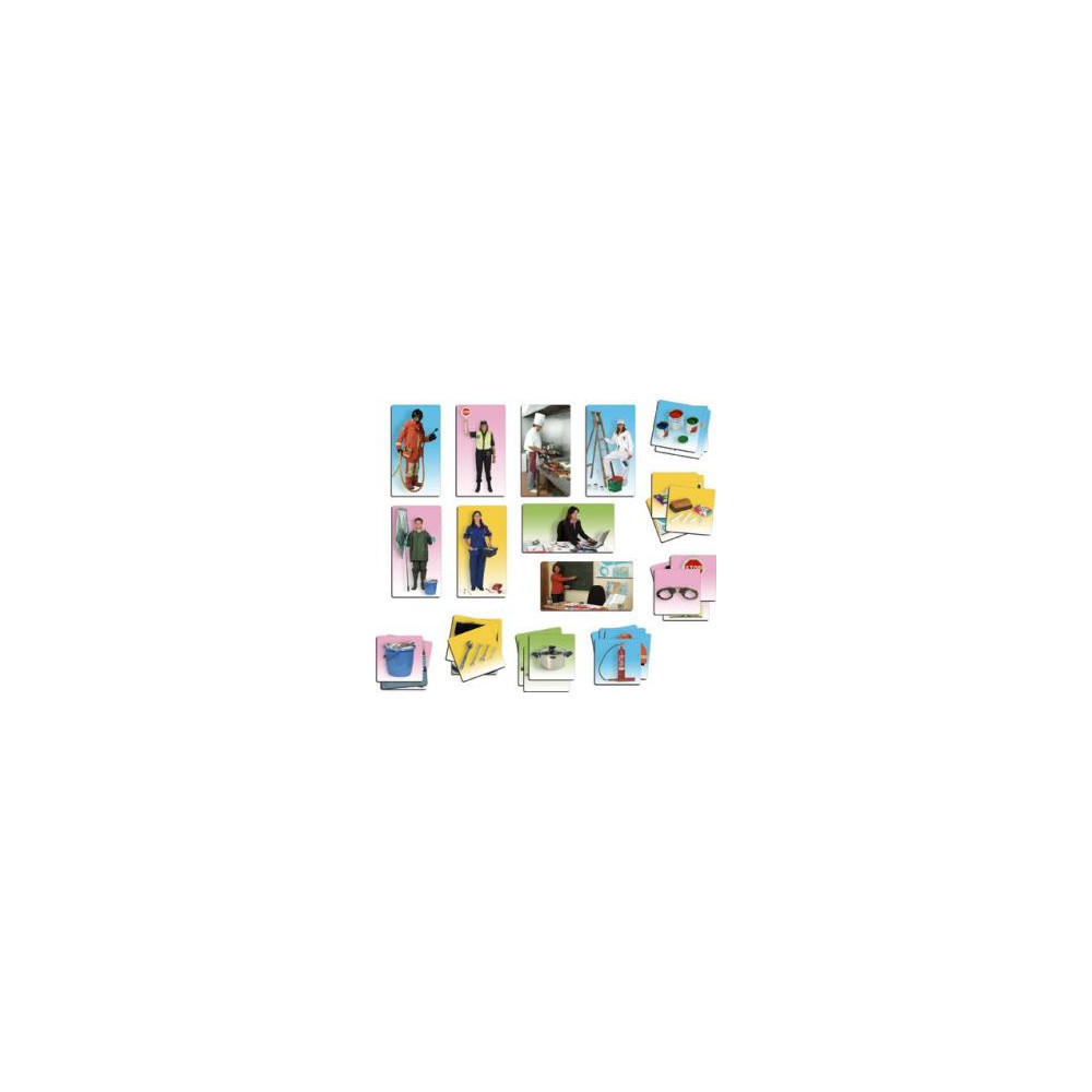 Juego de asociación para aprender a relacionar los oficios con su indumentaria y los útiles de trabajo propios de cada oficio. Incluye gúia. Sistema de auto-corrección en el reverso.