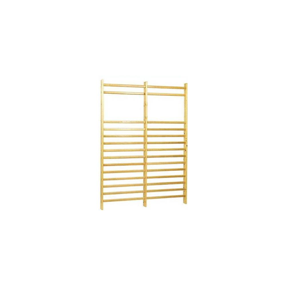 Espaldera de 2 cuerpos en madera. Madera de primera calidad barnizada. Compuesta de 14 barras transversales de pino de sección oval. Medidas: Alto 2300 / Ancho 1800 / Fondo 300 mm