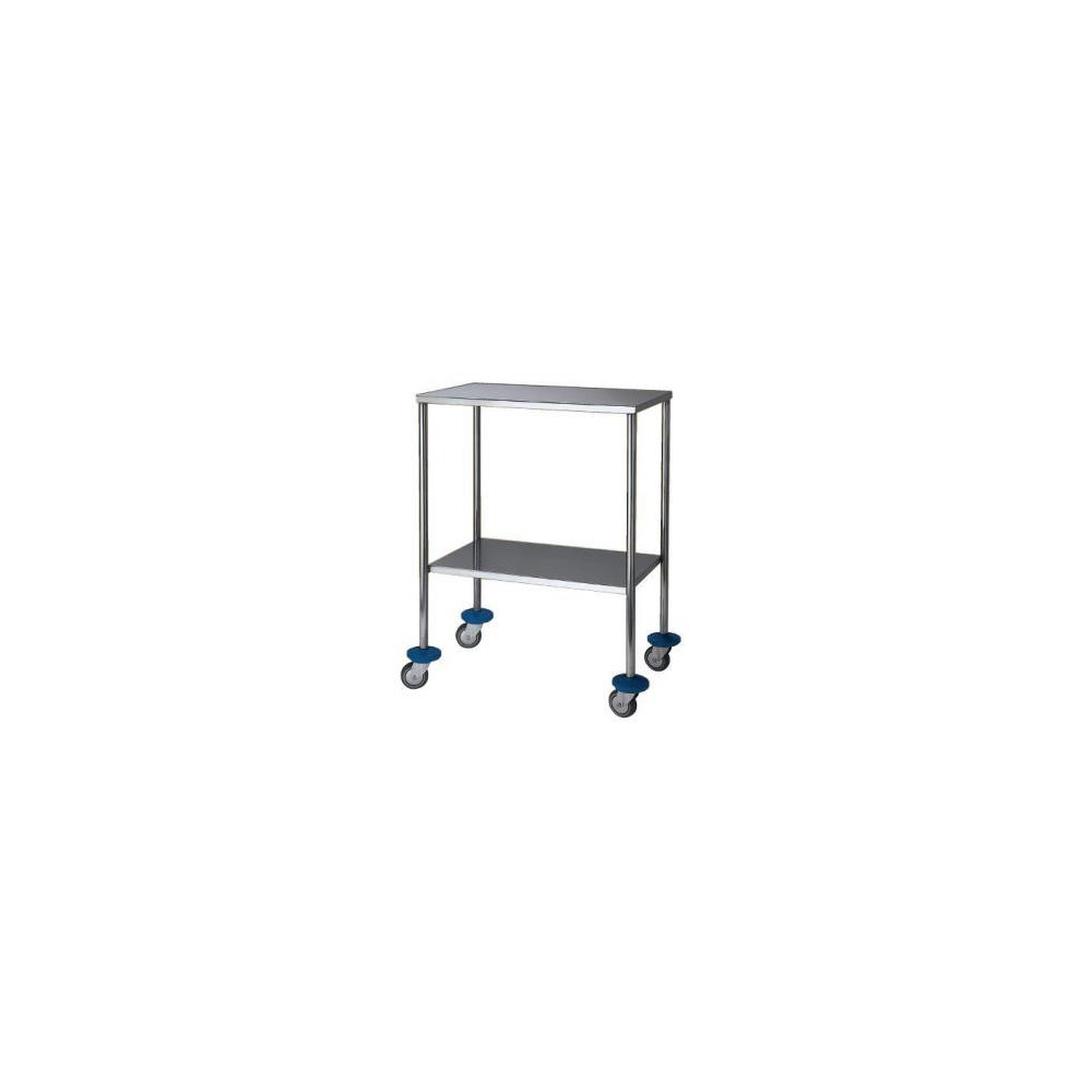 Mesas auxiliares de acero con 2 baldas. 4 ruedas de Ø 75 mm con paragolpes. Medidas: 600x400x840 cm. Peso: 8 Kg. Disponible en acero inoxidble (1MC0738-AI) y disponible en acero cromado (1MC0738-AC).