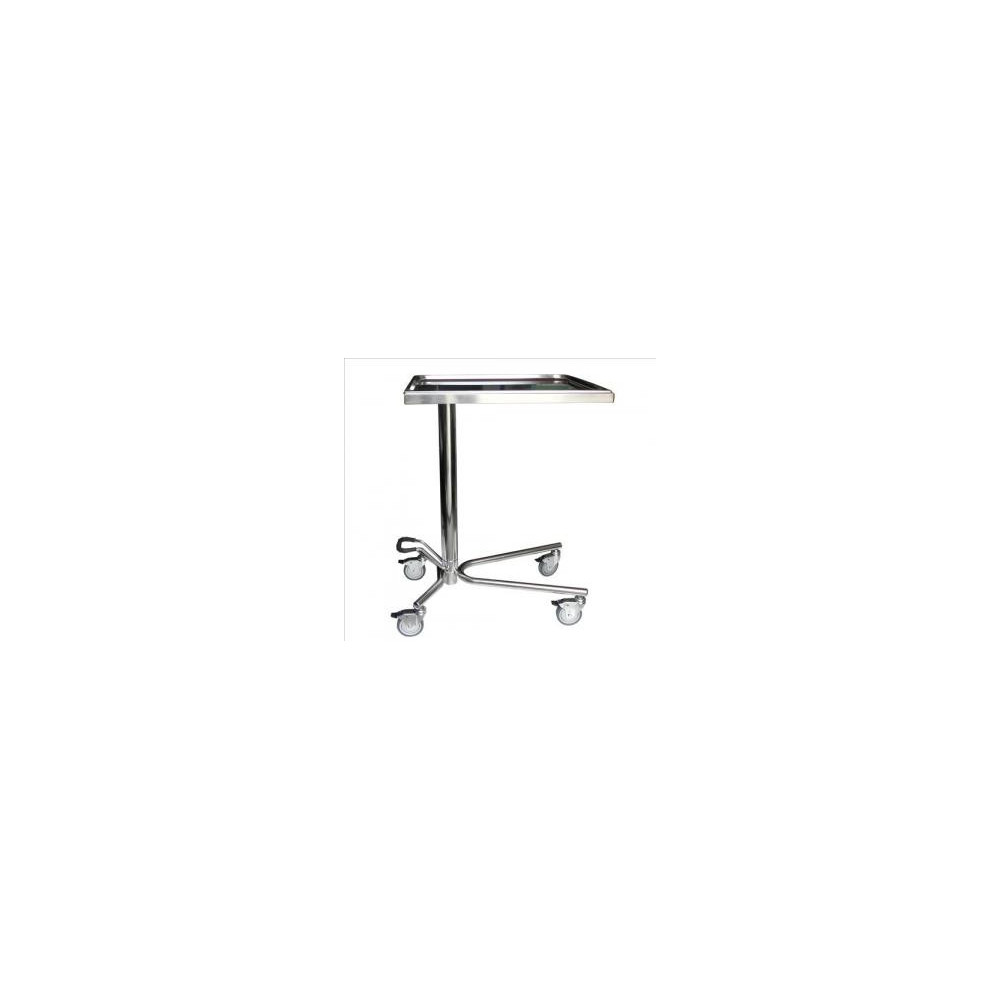 Mesa de acero cromado, con bandeja extraíble en acero inoxidable 18/8 desmontable de 630 x 560 mm. Regulable mediante sistema hidráulico. 4 ruedas de Ø 75 mm. 2 con freno. Peso: 25 Kg. Medidas: 650x 450x 900/120 cm.