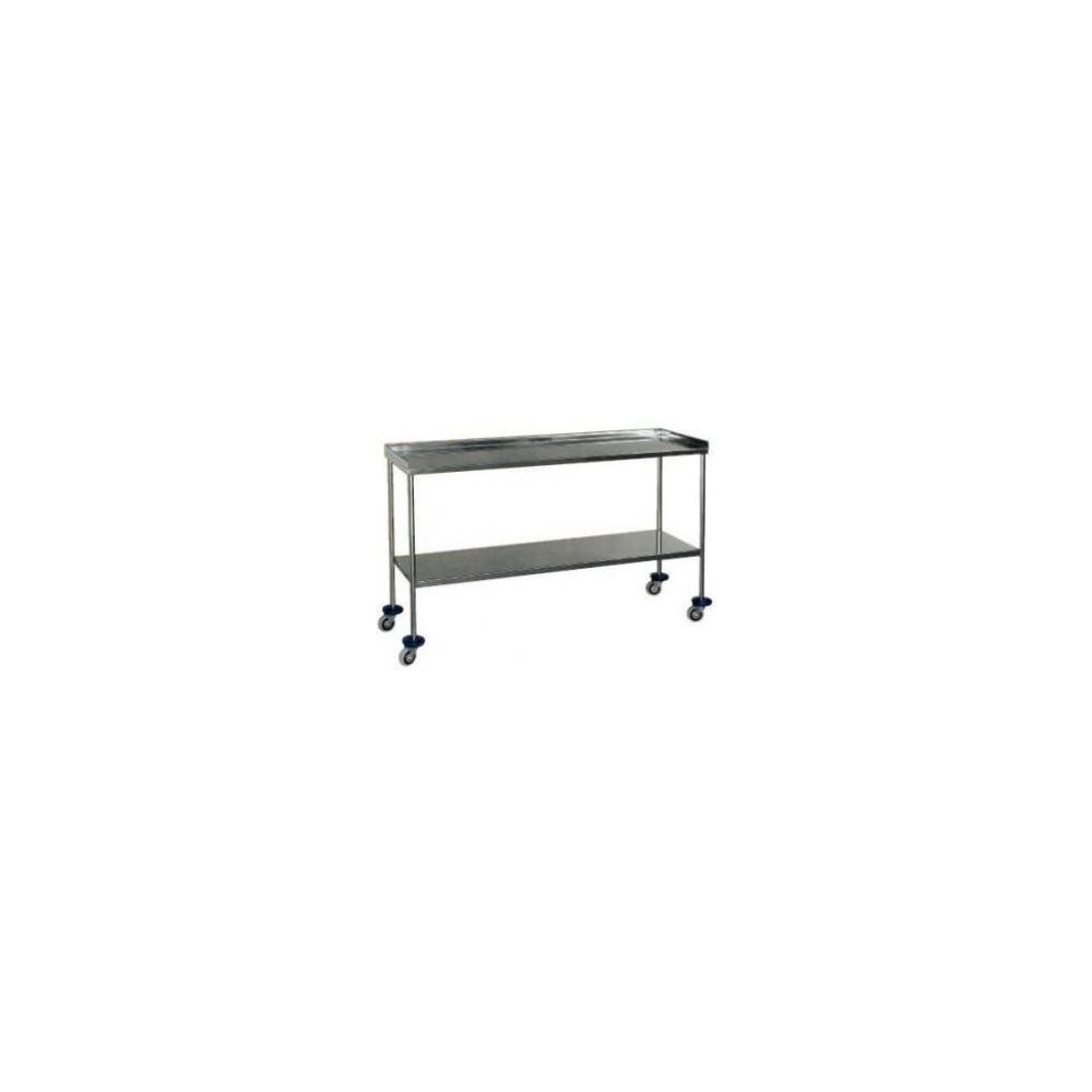 Mesa en acero inoxidable, con encimera con reborde en 3 lados y balda inferior lisa. 4 ruedas de Ø 75 mm. con paragolpes. Peso: 17 Kg. Disponible en dos medidas: 930 x 450 x 840 cm (1MC0747-93) y en 1200 x 450 x 840 cm (1MC0747-120).