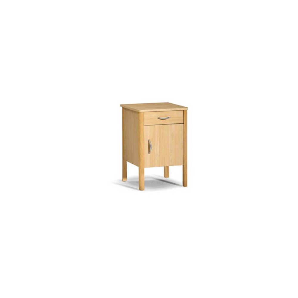Estructura: cuatro patas macizas de haya de 40 x 30 mm. Con frente curvo unidas por plafones laterales y posterior en tablero melaminado imitación haya de 1 6 mm. Superficie inferior diáfana para facilitar la limpieza. Tapa: tablero melaminado imitación haya de 1 9 mm. Cantos rectos chapados en pvc, con esquinas redondeadas. Barnizado patas: poliuretano de alta resistencia.Deslizadores en las patas.