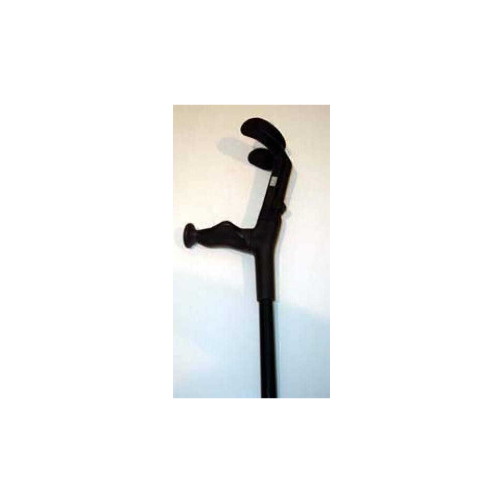 Bastón con puño anatómico para mano derecha e izquierda. Puño y codo compacto en termoplástico, con regulación de altura del apoyo del codo. Caña de aluminio endurecido lacada en negro o anodizada en gris. Distancia del puño a la codera: de 21 a 27 cm. Di