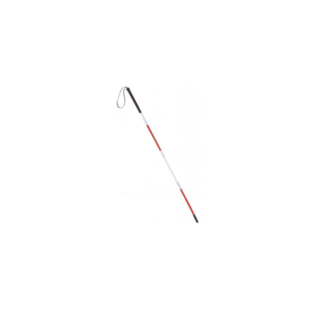 Fabricado en aluminio muy ligero con cuatro puntos para el plegado. Dispone de empuñadura de plástico con cinta. Cubierto con cinta reflectante en color blanco y rojo para mayor seguridad nocturna. Longitud: 116cm (33cm plegado).