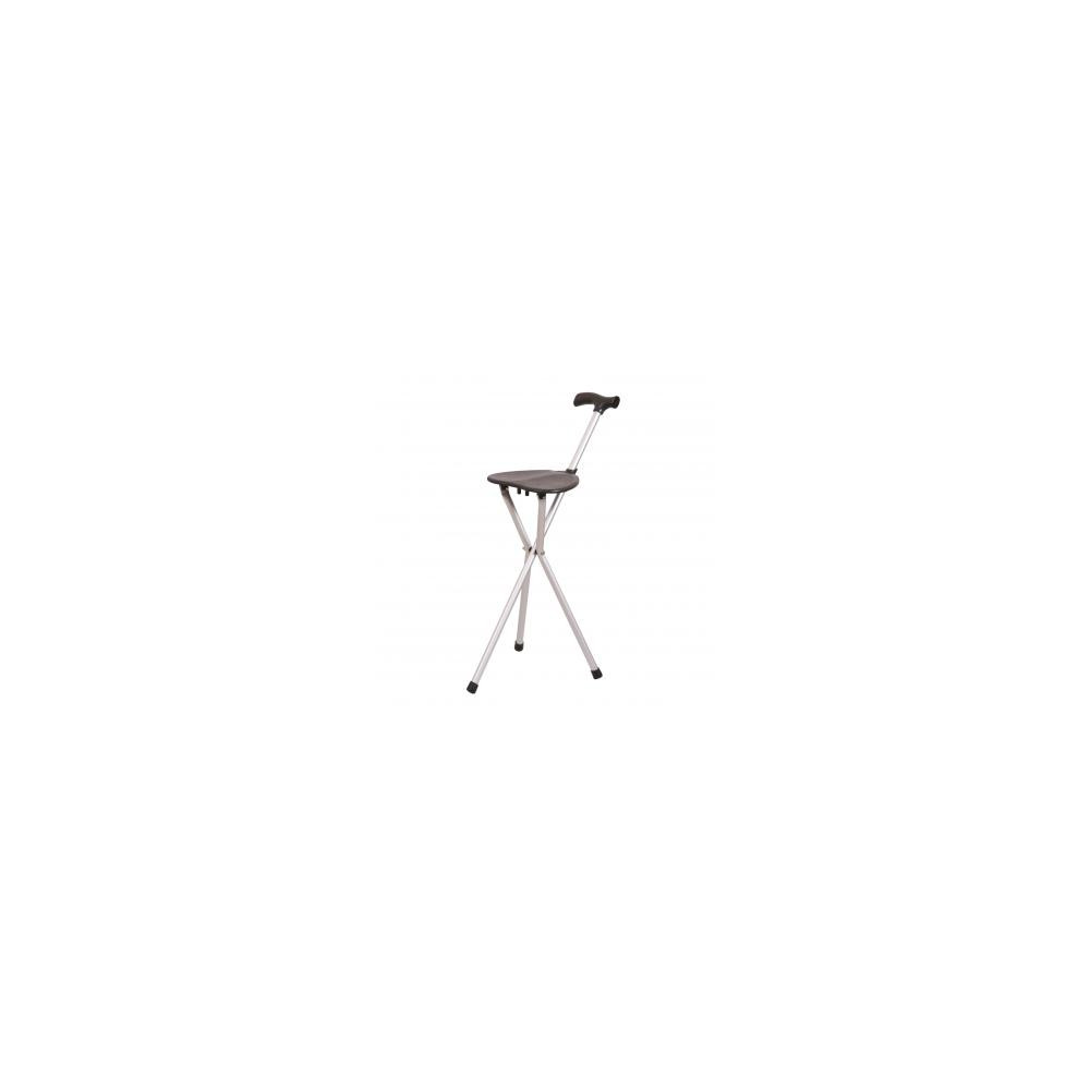 Bastón de aluminio plegable y con asiento. Para sentarse sólo a horcajadas. Altura total: 85 cm. Asiento-Suelo: 50 cm. Peso máximo: 90 Kg.