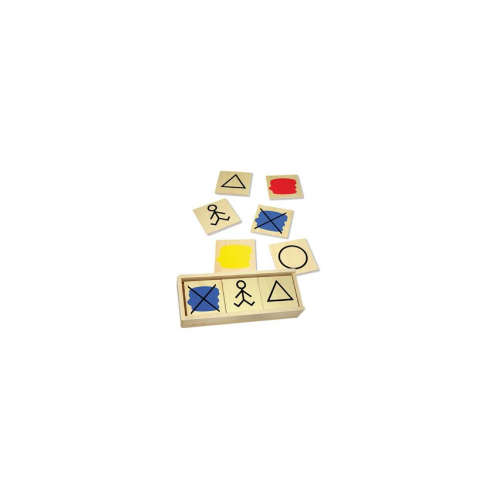 Juego de clasificación, para trabajar las propiedades de los bloques lógicos: colores, formas, tamaños, grosor y la negación de todas ellas. 20 piezas. Medidas 27x10x5.