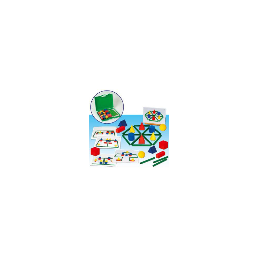 Juego compuesto de 14 cuerpos geométricos sólidos, 50 fotografías-modelo y 15 barritas alargadas. A partir de las fotografías se observa la posición de cada cuerpo com respecto al resto y mediante la manipulación reproduce las situaciones de las fotografías. Modelo, estableciendo una relación entre el espacio en tres dimensiones y su representación plana en dos dimensiones. Incluye guía y peana para sujeta las fotografías.