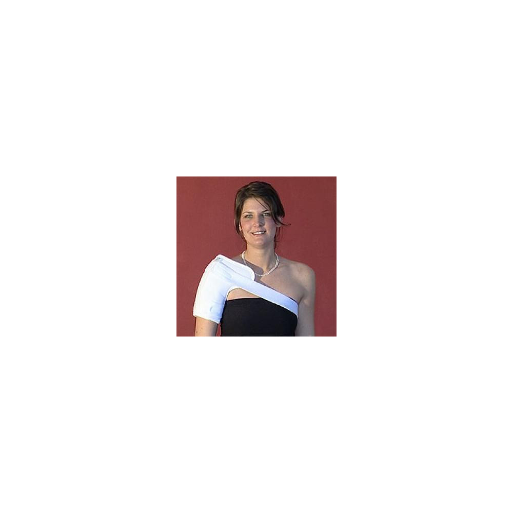 Se fija en torno a la parte superior del brazo con una cinta elástica de 30 cm de largo aprox. que dispone de cierres velcro en los extremos que se fijan directamente al material exterior del vendaje. La otra cinta elástica de 98 cm de largo aprox., equipada también con cierres velcro en los extremos, se cierra pasándola por la espalda, por debajo del otro brazo y sobre el pecho de nuevo sobre el vendaje. Parte externa: felpa. Capa intermedia: capa térmica, cuatro círculos con 780 Gauss cada una. Parte interior: espuma PE con un forro unilateral de moletón y estructura de barquillo. Lavado a mano 30°C con un detergente para ropa delicada