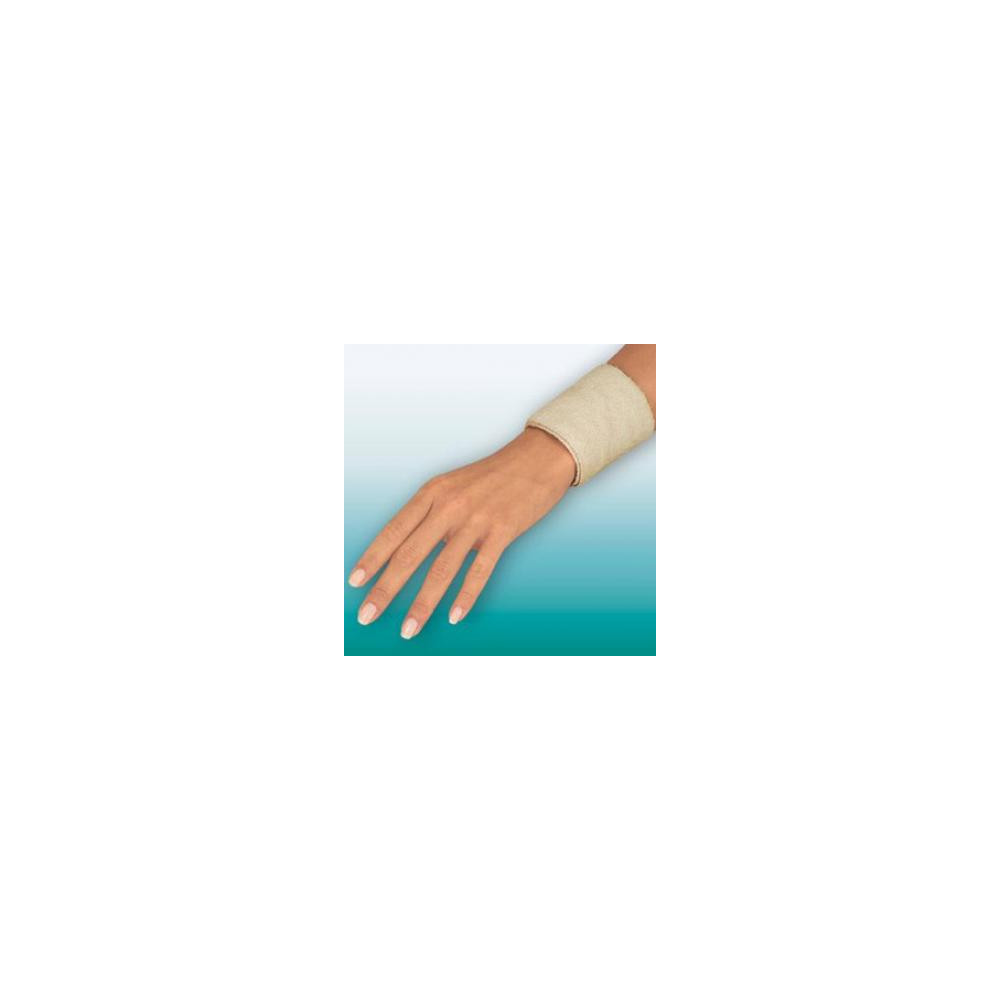 Muñequera elástica de 35 cm de longitud y 8 cm de altura. Indicada para esguinces, tendinitis y artrosis. Composición: algodón 60%, nylon 5%, Elastómero 6%, cobre 6%, zinc 6%, silicio 17%.