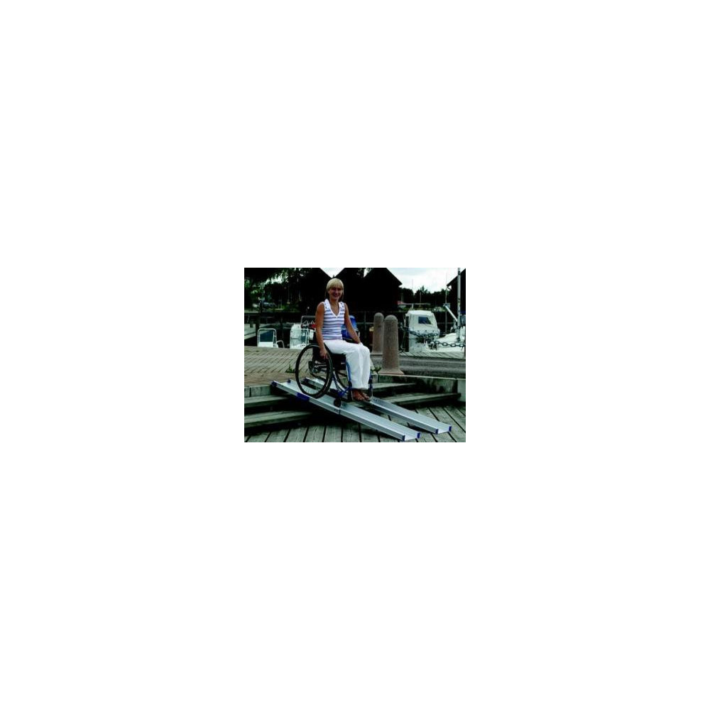 Rampas de aluminio plegables que proporcionan una amplia gama de soluciones frente a los problemas diarios y no sólo para los usuarios de sillas de ruedas. El peso se ve reducido gracias a las perforaciones hechas en la rampa, obteniendo una excelente superficie antideslizante. Estas rampas pueden instalarse en cualquier lugar sin necesidad de usar herramienta alguna. Ref. S055-110 largo mínimo 55 cm, máximo 110 cm, ancho interno 21 cm, peso máximo autorizado 300 kgs. Ref. S055-150 largo mínimo 75 cm, máximo 150 cm, ancho interno 21 cm. peso máximo autorizado 300 Kgs. Ref S055-200 largo mínimo 100 cm, máx. 200 cm, ancho interno 21 cm, peso máximo autorizado 250 Kgs. Ref S055-212 largo mínimo 106cm, máx: 212, ancho interno: 26,5cm, peso máximo autorizado 300 Kgs.