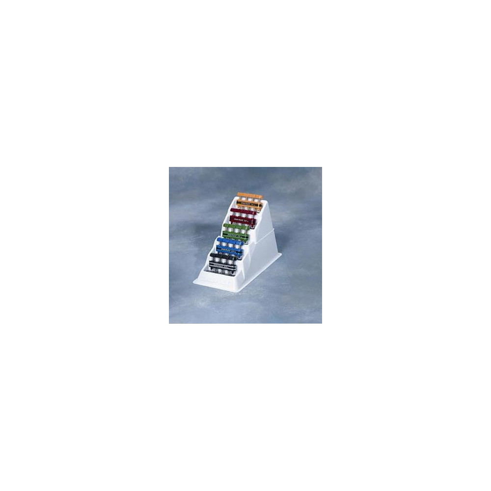 Desarrolla la fuerza, la flexilbilidad y la coordinación en las manos. Los colores indican la resistencia. En orden ascendente van amarillo, rojo, verde, azul y negro. Peso: 80 g.