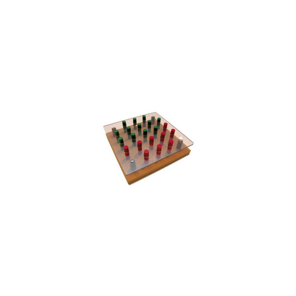 Tabla de madera y metacrilato para insertar clavijas de dos colores. Ideal para mejorar la destreza manipulativa y la coordinación. Peso: 1,85 Kg.