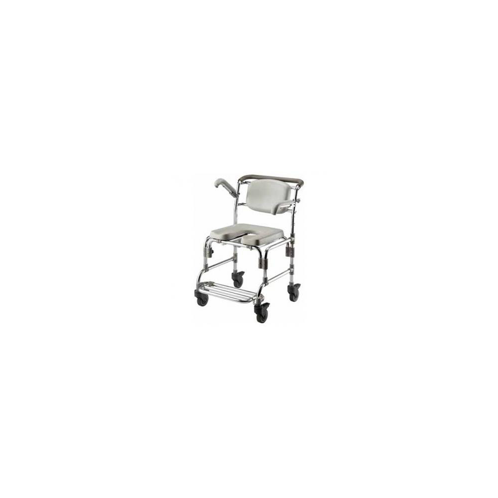 Comoda Silla para transportar, fabricada en aluminio. Asiento, respaldo y posabrazos realizados en poliuretano. Puede usarse como silla de baño. Asiento en forma de U. Incluye cinturón. Posabrazos abatibles. Peso máximo de usuriao: 150 Kg. Ancho total: 55 cm. Ancho asiento: 49 cm. Profundidad asiento: 40 cm. Altura asiento: 53 a 56 cm. Altura total de la silla: 92 a 95 cm.