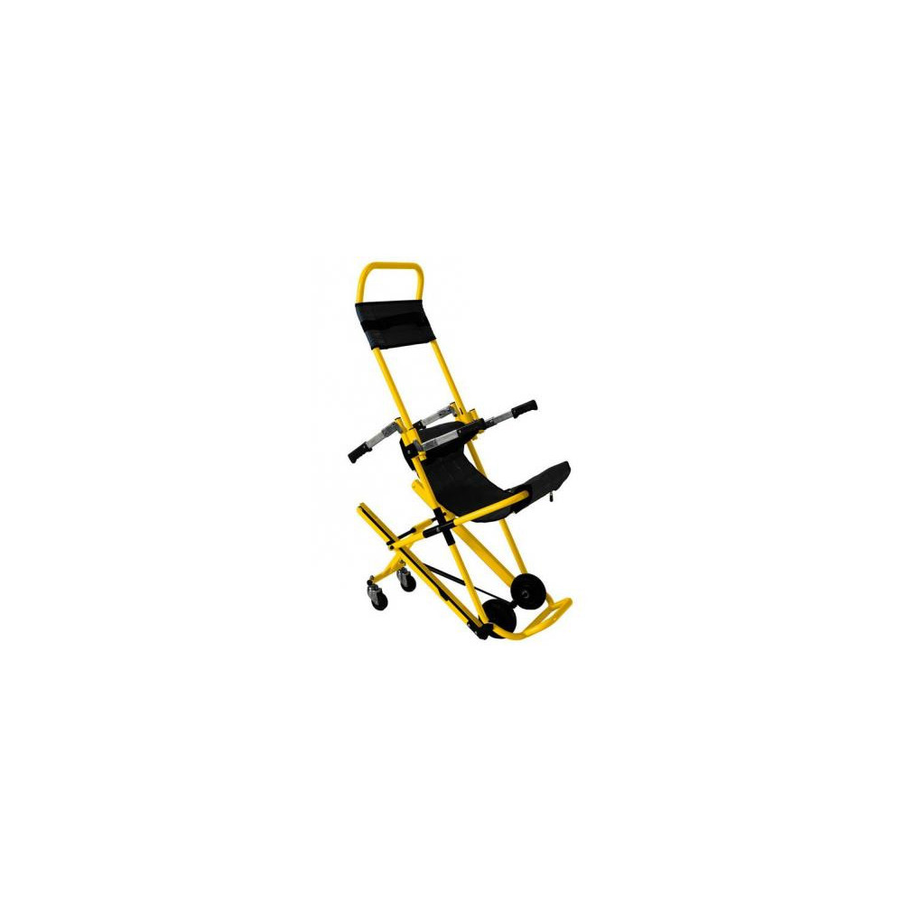 La silla ofrece las prestaciones de una silla de traslado convencional con la posibilidad de facilitar la subida y bajada de escaleras gracias a su sistema de oruga con sistema antideslizamiento. Estructura de aluminio ligero pintada en color amarillo y una lona acolchada negra de gran resistencia (doble costura), acolchada y de fácil limpieza. Dispone de 4 empuñaduras plegables en la parte del respaldo para facilitar su manejo en escaleras y un reposa-píes tubular para el usuario. 2 juegos de cinturones con hebilla clip. Se caracteriza por su gran maniobrabilidad gracias a sus 4 ruedas (2 giratorias y 2 con freno) y su rápido sistema de plegado. Dimensiones: 80cm. (largo) x 54cm. (ancho) x 142cm. (alto).;Peso 12Kg. Capacidad de carga 160Kg.
