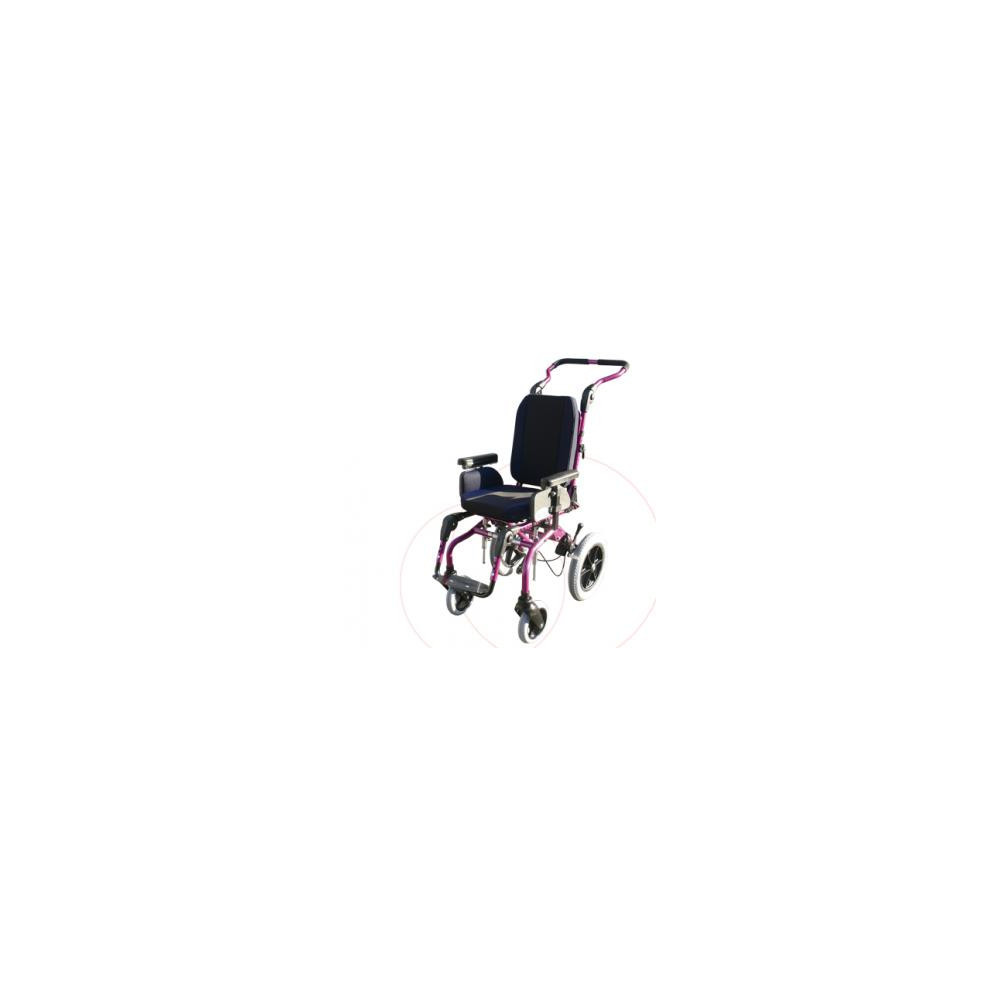 Chasis silla basculante. Barras empuje graduables en inclinación. Respaldo graduable en inclinación y profundidad. Asiento graduable en profundidad. Reposapiés graduables en inclinación y altura. Reposabrazos graduables en anchura y altura. Color chasis: gris, violeta o verde. Color tapizado: negro/verde, negro/azul o azul/azul claro. Peso máximo: 60 Kg.