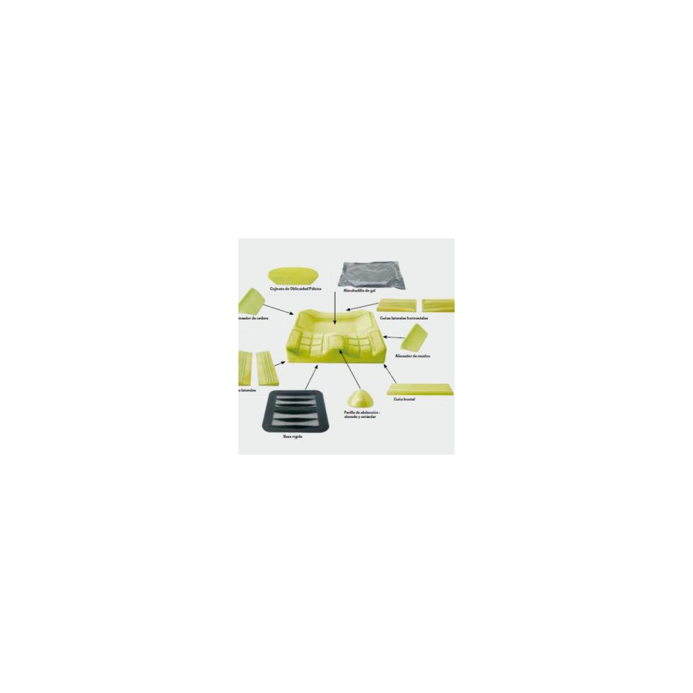 Cojín que combina las excelentes propiedades de reducción de presiones con el manejo de posicionamiento y la facilidad para realizar correcciones activas. El cojín moldeado en perfil bajo lleva una doble capa de gel visco líquido repartido en celdas en la zona de los isquiones y del saco. Las celdas de gel y espuma aumentan la superficie de soporte proporcionando un mayor grado de protección para los usuarios con muy alto riego de desarrollar escaras por presión. Dispone de funda en color negro bi-elástica, impermeable, transpirable, con base antideslizante y con doble cremalleras. Disponible en dos tamaños: 40x40 y 43x43 cm. Altura 7.8 cm. Peso máximo del usuario 140 Kg. Peso: 3.08 Kg. A través del uso del sistema modular, está diseñado para promover las correcciones activas en conjunto con el manejo de las presiones. El sistema modular está compuesto por: M112-CO cojinete para oblicuidad pélvica, M112-AC alienador de caderas, M112-AM alienador de mulos, M112-AS abducción estándar, M112-AE abductor elevado, M112-CLH cuñas laterales horizontales, M112-CLV cuñas lateras verticales, M112-AG almohadilla de gel, M112-CF cuña frontal, M112-BR base rígida tamaño estándar.