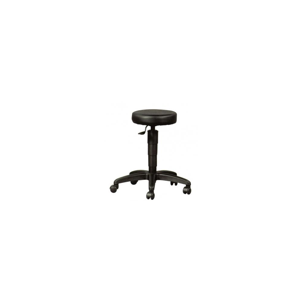 Taburete giratorio, regulable en altura: 47-59 cm. Diámetro del asiento: 30 cm. Ancho total (ruedas) 54 cm. Distintos colores. Funda en skai. Densidad 25 Kg.