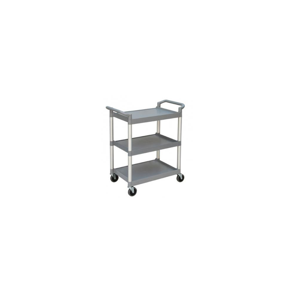 Carro fabricado en polipropileno. Color gris. Columnas laterales color aluminio. Estantes moldeados. Ruedas giratorias. Dimensiones: 845 x 430 x 950 mm H. Carga máxima por estante: 45 Kgs.