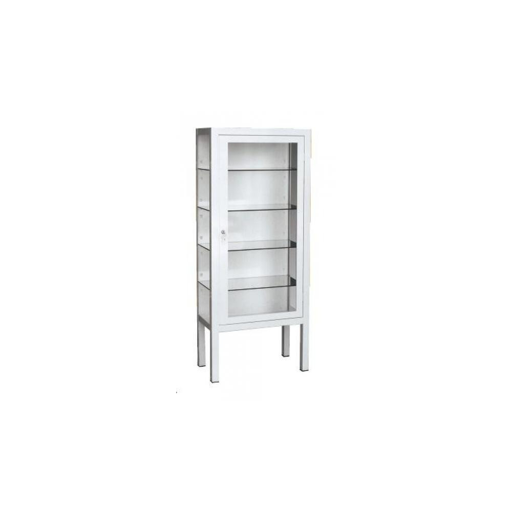 Vitrina de acero con 1 puerta de cristal abatible y cerradura, compuesta de 4 baldas de cristal regulables en altura. Peso: 38 Kg. Medidas: 600 x 350 x 1460 cm. Disponible en acero esmaltado (1MC0918-AE) y en acero inoxidable (1MC0918-AI).