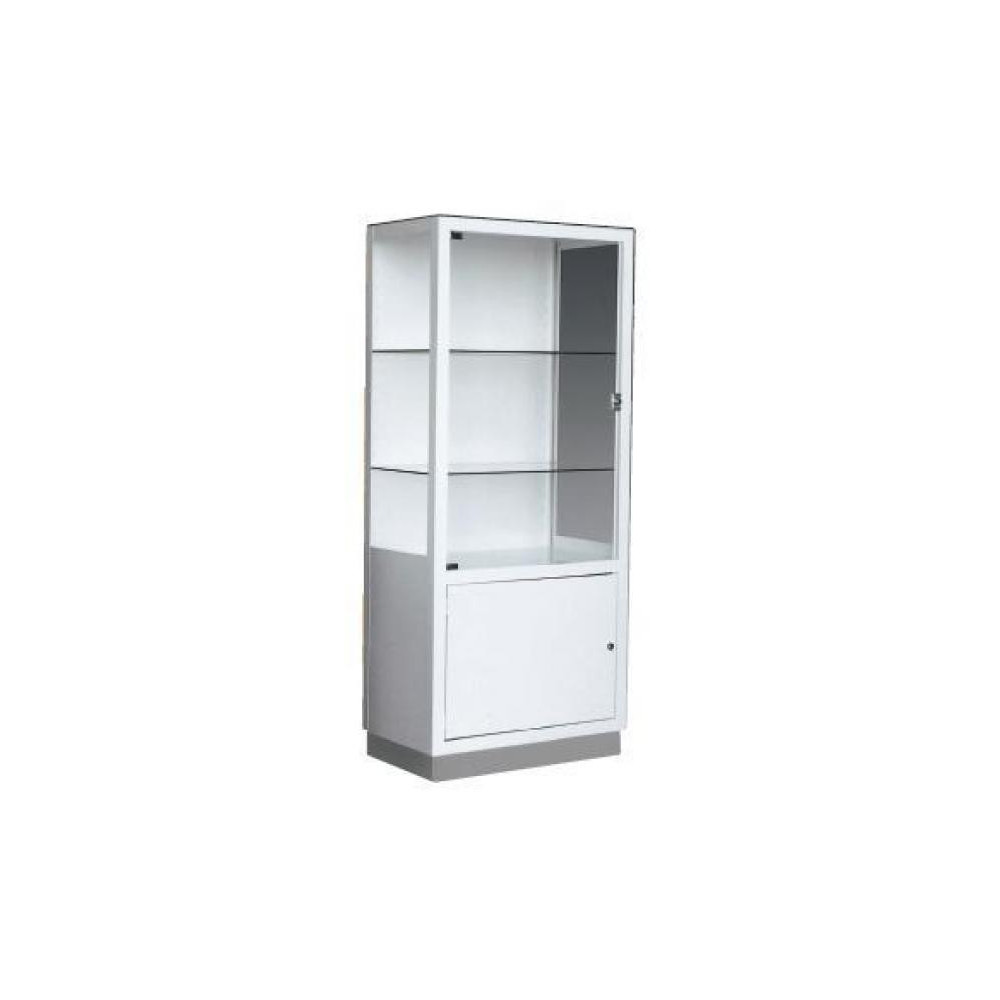 Vitrina de acero con 1 puerta de cristal abatible y cerradura, compuesta de 2 baldas de cristal regulables en altura y zócalo en acero inoxidable. Laterales de cristal. La parte inferior está compuesta por 1 puerta abatible metálica con cerradura y en su interior una balda fija. Peso: 40 Kg. Medidas: 700 x 450 x 1600 cm. Disponible en acero esmaltado (1MC0923-AE) y en acero inoxidable (1MC0923-AI).