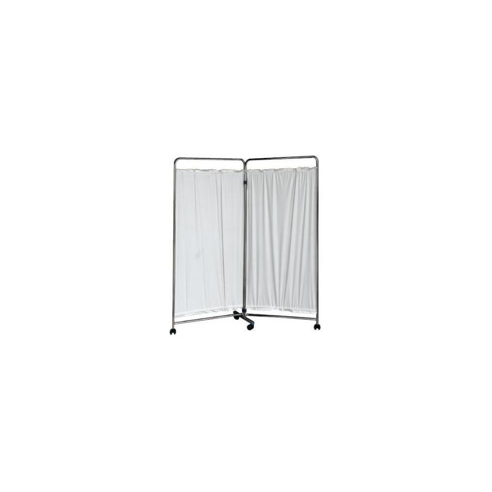 Biombo en acero de 2 cuerpos plegables e independientes. Blanco de tela plastificada, desmontable y lavable. Peso: 6 Kg. 4 ruedas de Ø 50 mm. Medidas: 1450x1710 cm. Disponible en acero esmaltado (1AMC067-AE), en acero cromado (1AMC067-AC) y en acero inoxidable (1AMC067-AI)