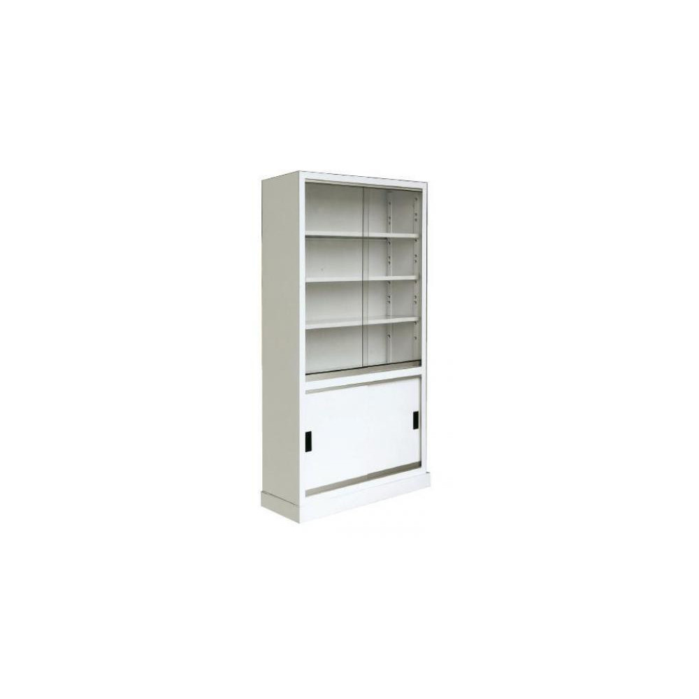 Vitrina de acero compuesta en la parte superior por 2 puertas de cristal correderas y 3 baldas metálicas graduables en altura, la parte inferior está compuesta por un armario con puerta corredera metálica y 1 estante fijo. Medidas: 1000 x 420 x 1990 cm. Disponible en acero esmaltado (1MC0928-AE) y en acero inoxidable (1MC0928-AI).